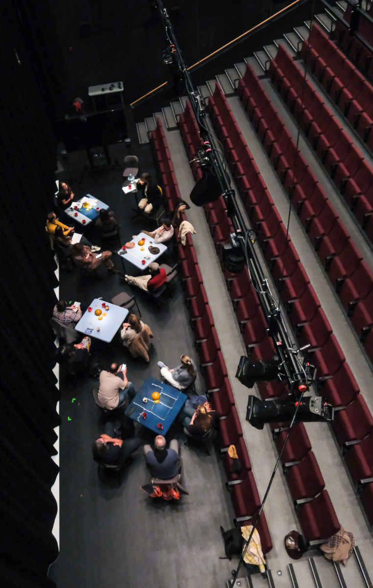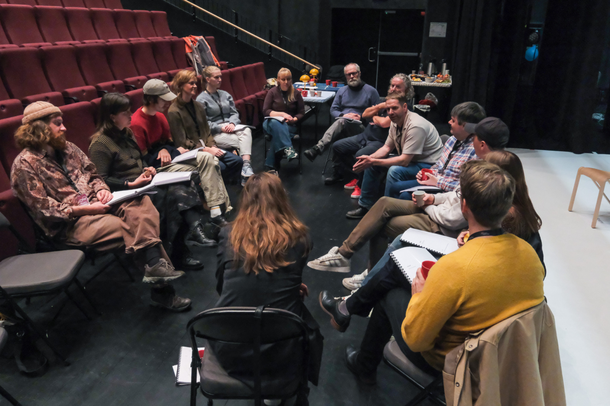 Etter desse ganske så oppløftande kjærleiksråda, gjekk gjengen på bransjetreffet inn att i teatersalen for ei runde med norsk dramatikk. Dei las Maria Tryti Vennerød sitt stykke «Goliat» frå 2018 og reflekterte rundt det i lag, og etterpå sette dei seg godt tilrette i amfiet – og nokre la seg rett ut på golvet – og høyrde Arturo Tovar si lydoppleving «Gebrokkent: Eg vil heim». I verket høyrer vi stemmene til menneske som har kome hit frå heile verda. Viss du også vil høyre lydopplevinga, finn du den HER.