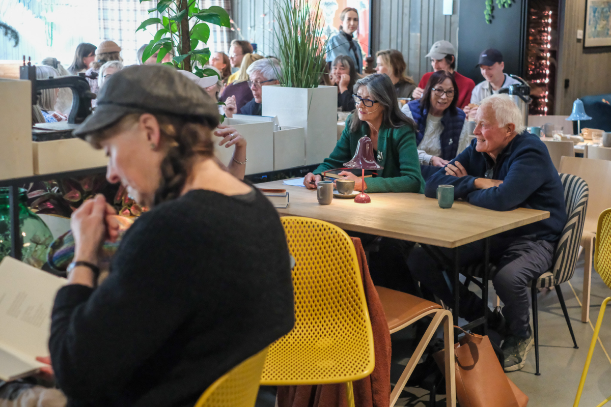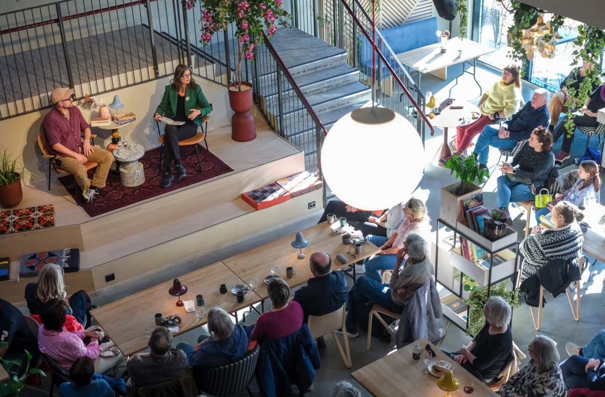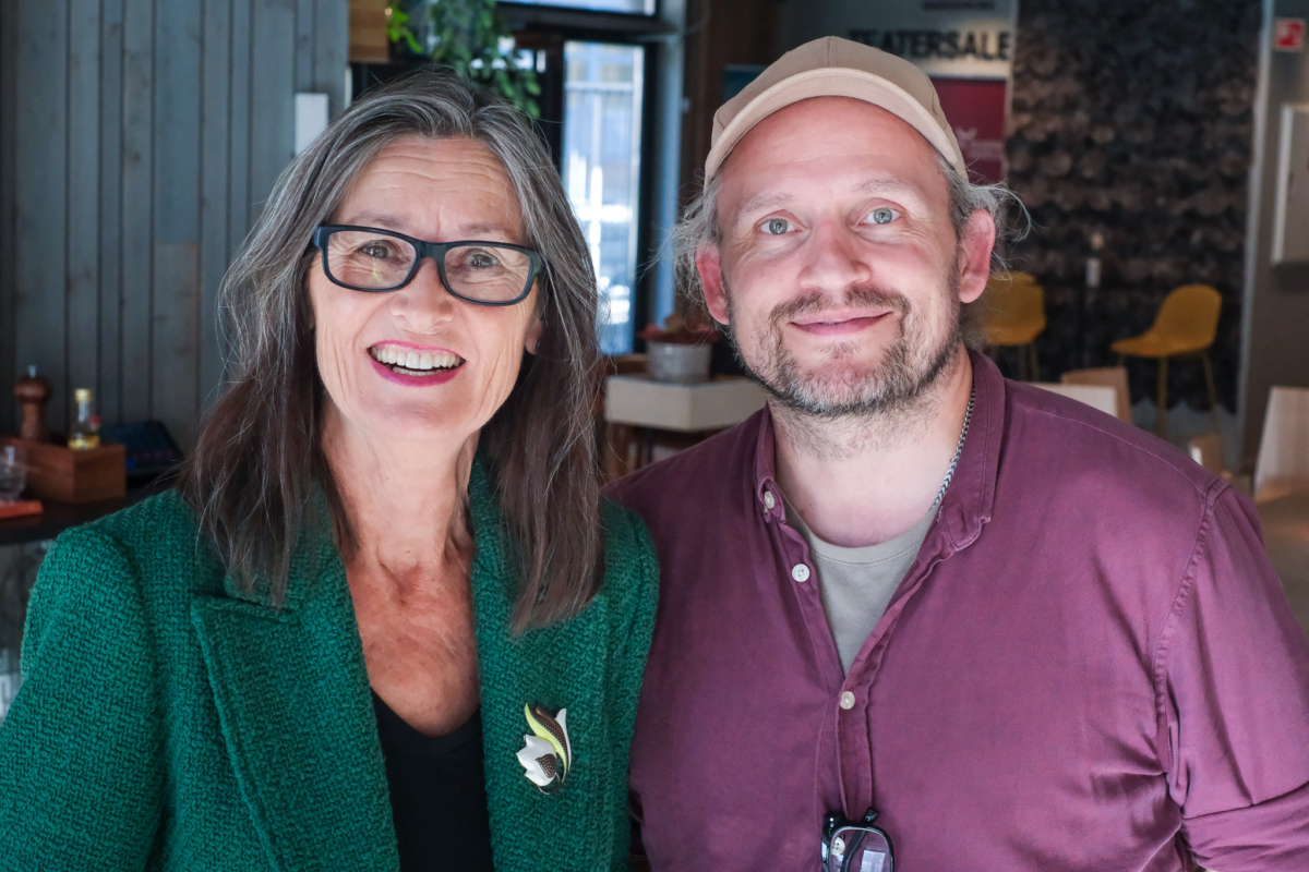 I lunsjen fylte vi på med endå fleire inntrykk, til ein smak av bagett og kaffi. Vi flytta oss ut på foajescena i Røyst mat & vin, der psykolog Sissel Gran og poet Joakim Kjørsvik møttest til ein samtalte om å sette ord på det vi elskar. Teaterkafeen var eit sideprogram til «Eg er Lucy Barton» og eit samarbeid med Rom for ord.