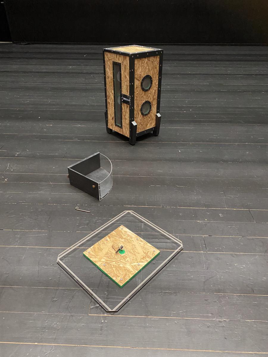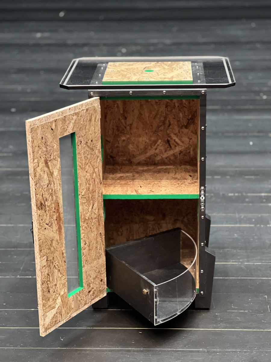 Frå estetikk til handverk. Plattforma må jo monterast også. Hovudkassen er limt og skrudd saman, og så har den fått heimelaga hjørnebeslag av kryssfiner, pynta med kunstige metallnagler. Døra er festa med pianohengsle, mens pleksitoppen er avtagbar og festa med vingemutrar frå undersida.