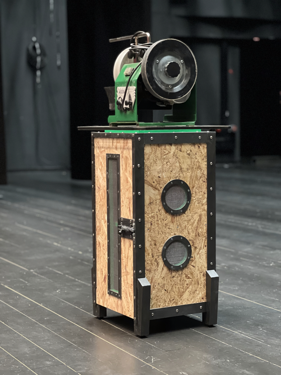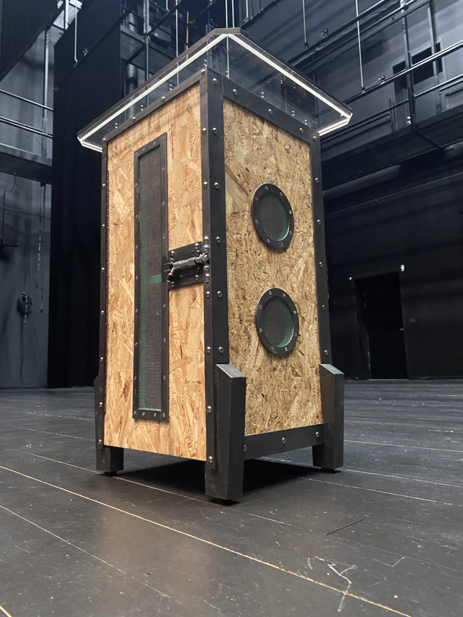 Materialbruken består av OSB-plater som hovudmateriale, furuklossar til bein, kryssfiner til hjørnebeslag, pleksiglass til toppplate og divers pianohengsler og beslag. Og ein aldri så liten dose fri fantasi. Flugenetting i metall har estetiske kvalitetar og i tillegg ein praktisk funksjon med å ventilere boksen.