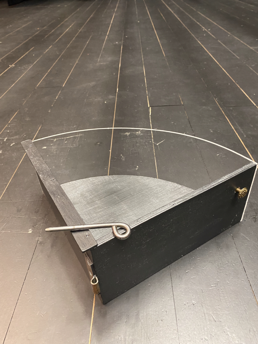 Den uttrekkbare skuffen er festa med splitthengsle, noko ein finn mykje av i teaterscenografiar «all over». Det gjer at den kan hurtig avhengslast og tømmast, eventuelt løftast opp og plasserast på til dømes ekstern arbeidsplattform.
